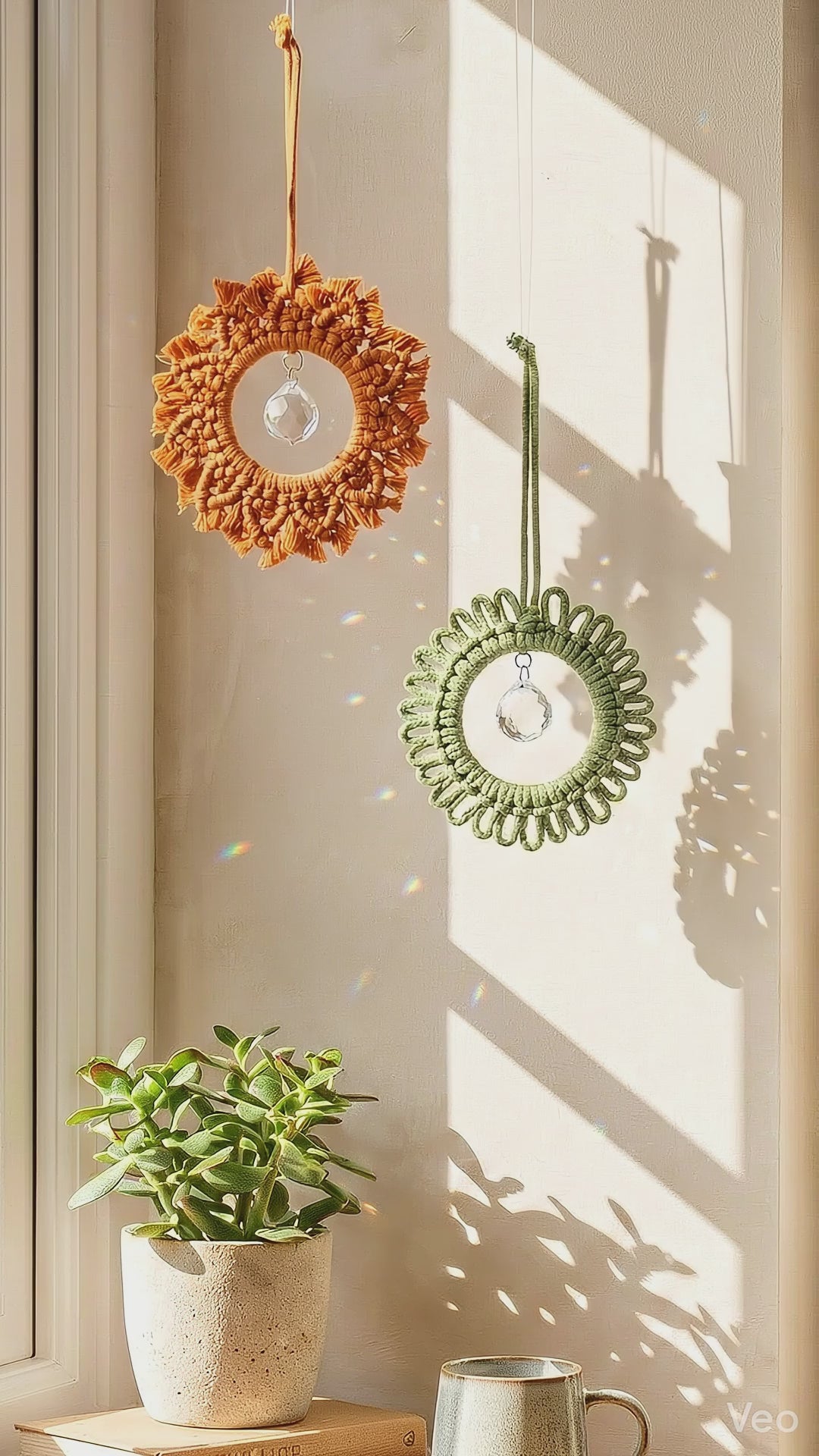 Bring light and warmth into your space with this macrame suncatcher designed to reflect sunlight beautifully throughout the room. This crystal suncatcher combines delicate macrame artistry with a sparkling crystal window decor element that creates soft rainbow reflections when placed near natural light.