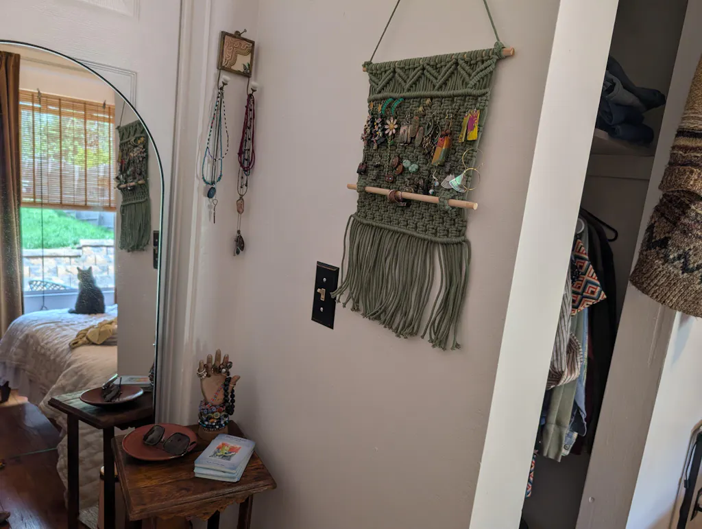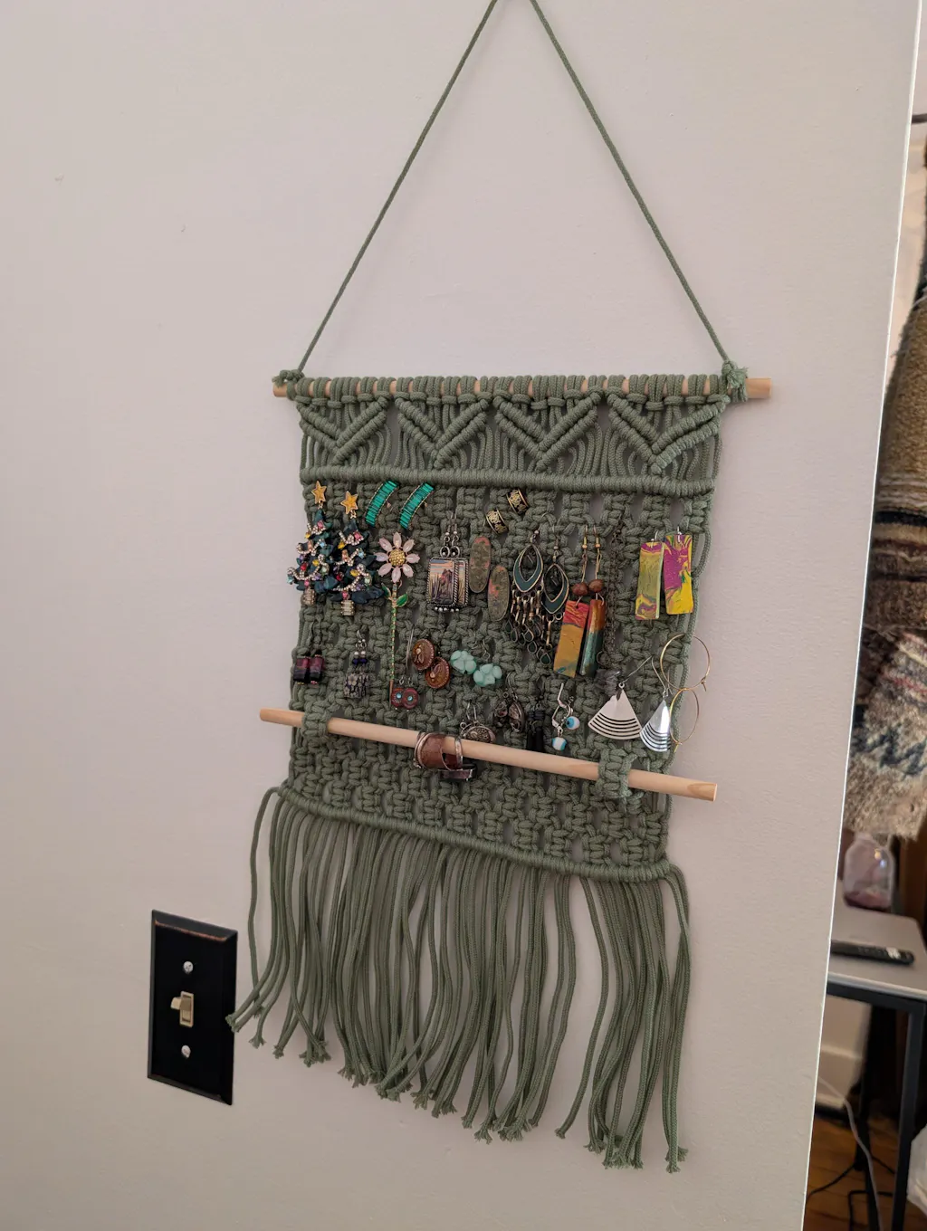 This macrame earring holder is a handcrafted wall organizer designed to beautifully display and store women’s jewelry. Made from macrame cord and supported by a wooden stick, it keeps earrings and accessories visible, tidy, and easy to reach while adding a soft decorative touch to your space.