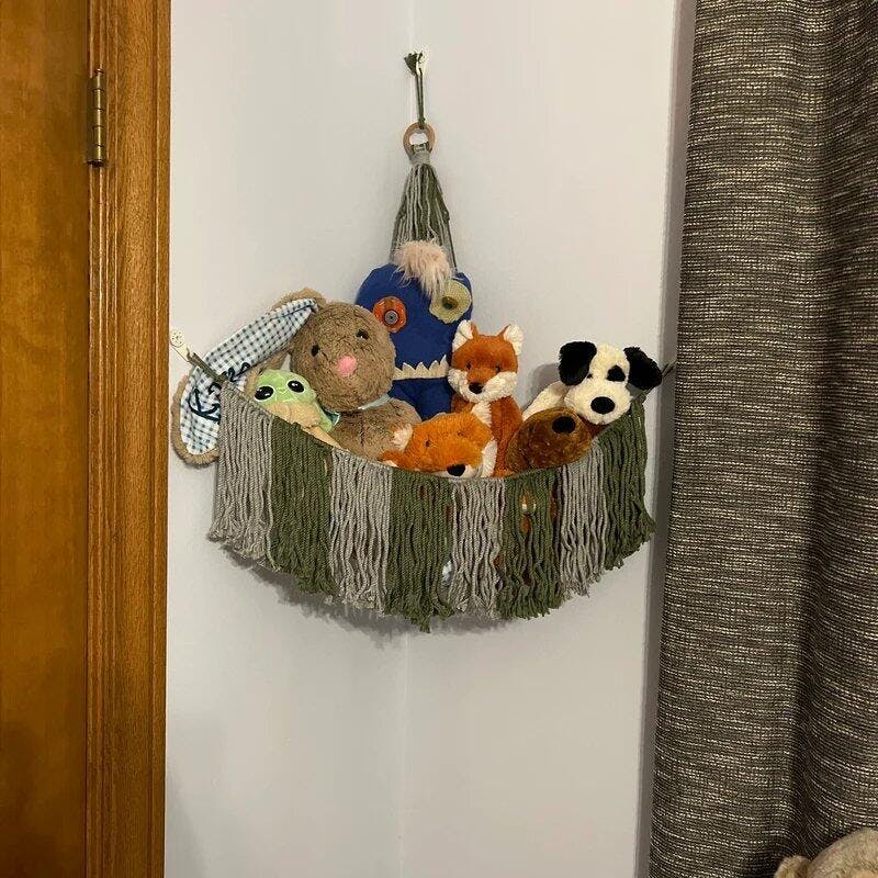 This macrame toy hammock is a functional and decorative wall solution designed to organize stuffed animals and soft toys in a playful way. Made from macrame cord and supported by a wooden ring, it helps keep kids rooms tidy while adding a cozy handmade accent.